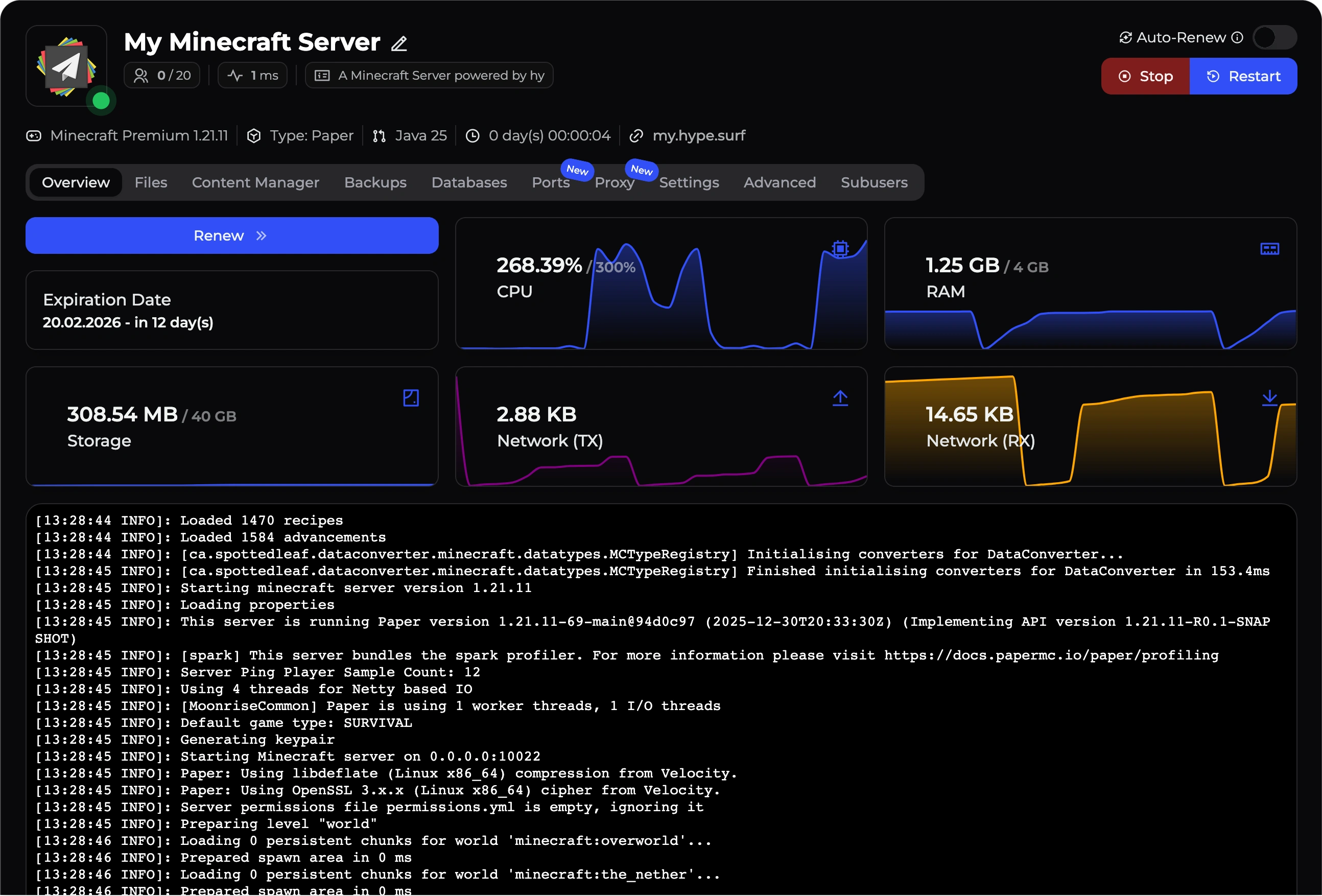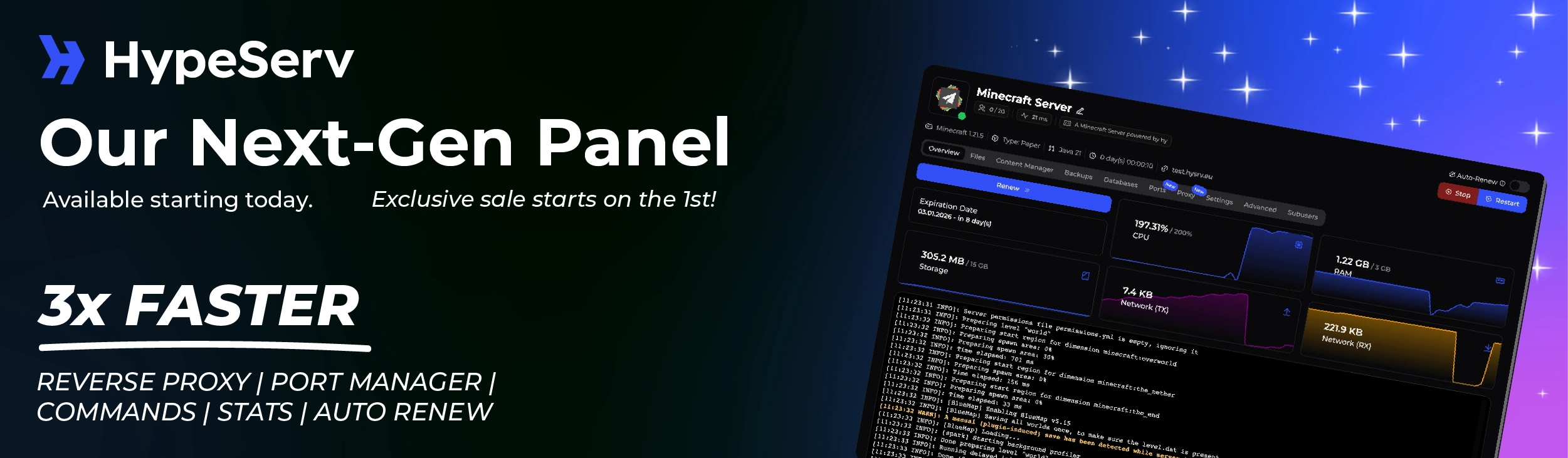 Entdecke das komplett neu entwickelte HypeServ Control Panel: optimiert für Geschwindigkeit, Zuverlässigkeit und einfacheres Servermanagement. Mit schnellerem Dateimanager, smarter Konsole, granularen Permissions, Auto-Renewals und mehr. Ideal für Gamer, Creator und Communities.