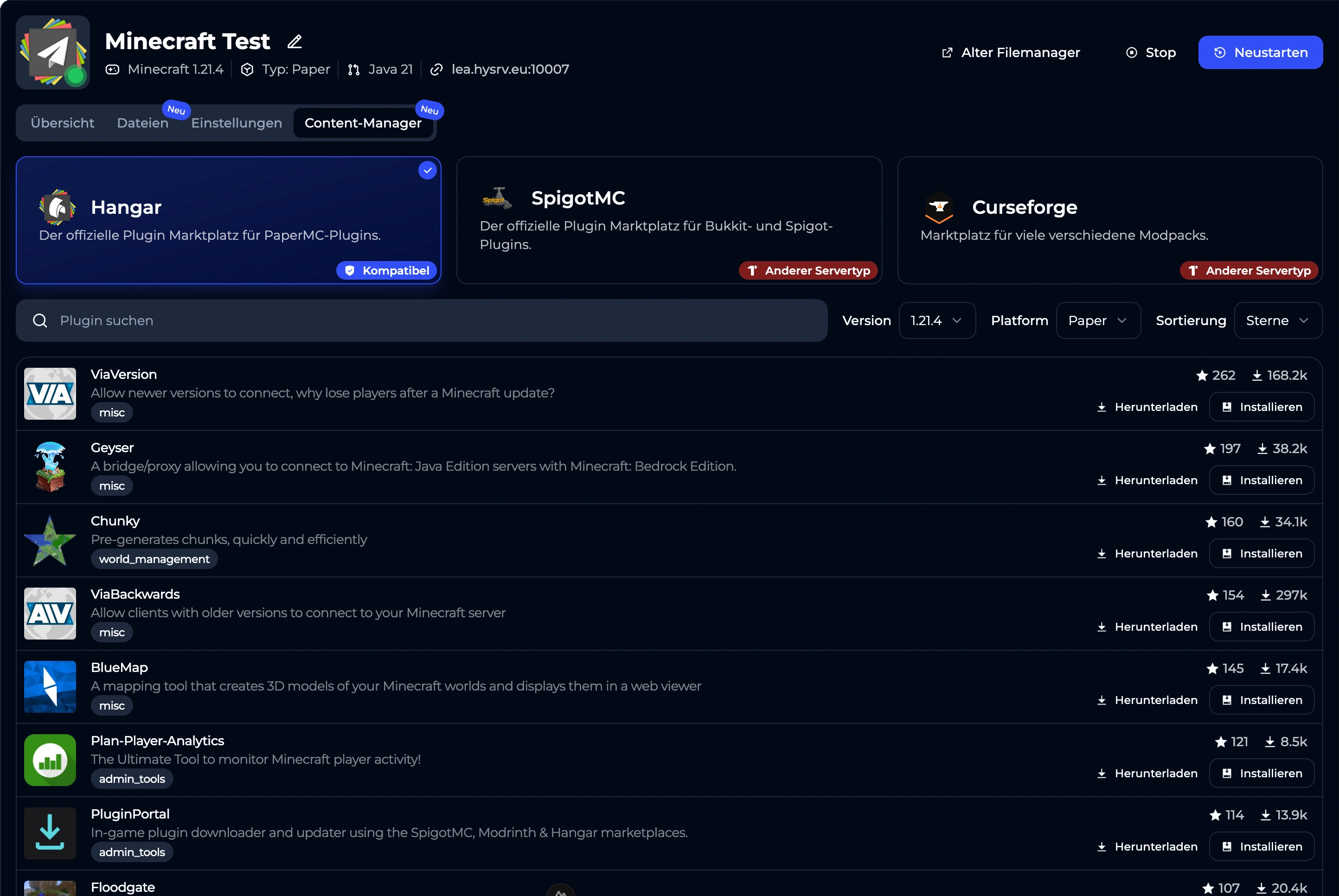 Mit unserem modernen Interface ist die Serververwaltung ein Kinderspiel. Im Content-Manager kannst du Plugins und Modpacks suchen und mit einem Klick auf deinem Server installieren.